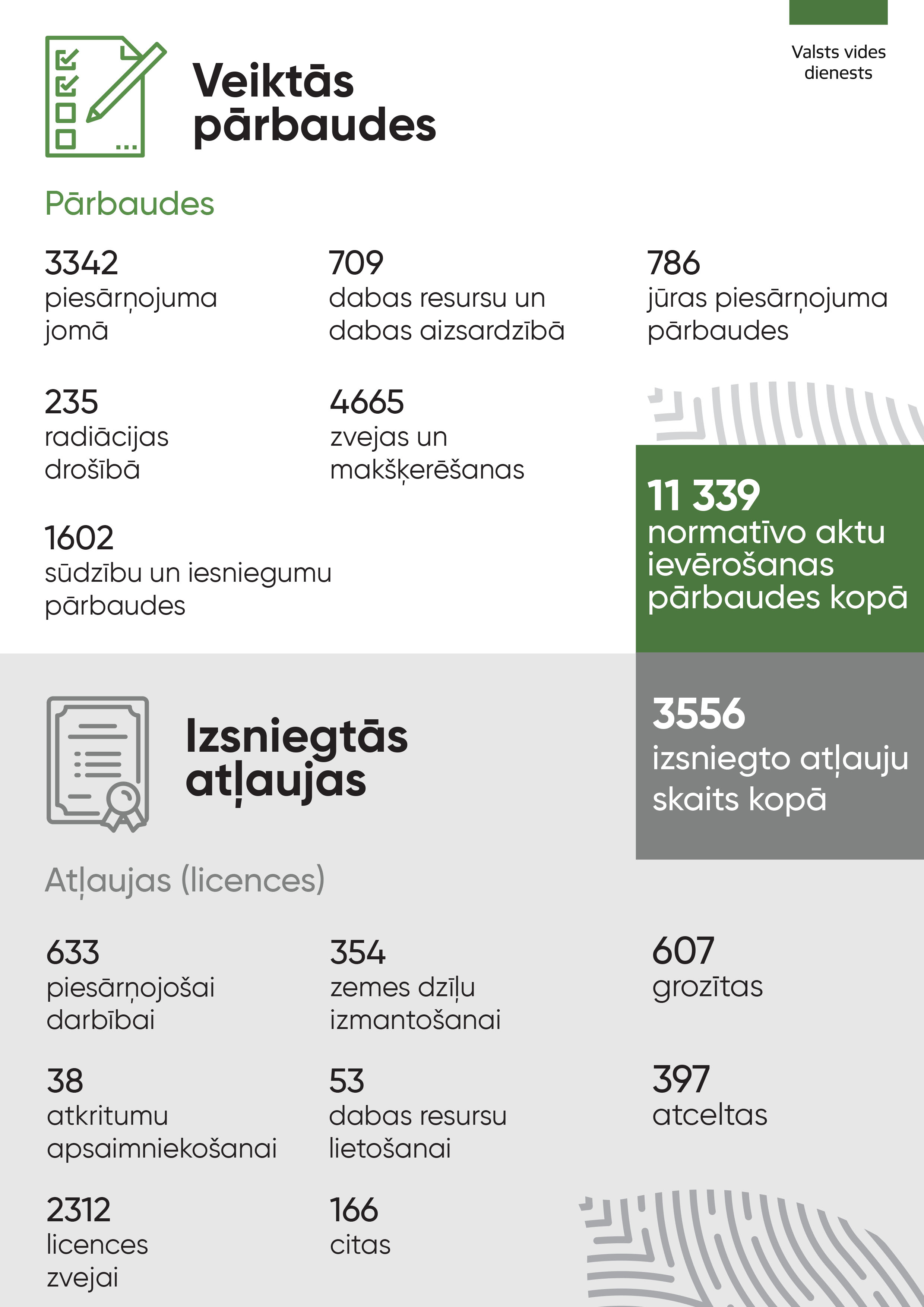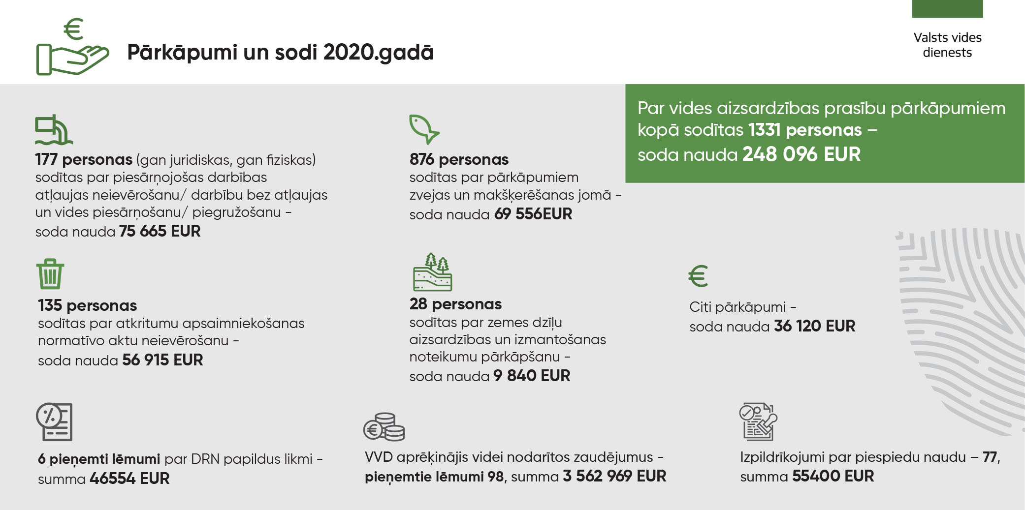 Valsts vides dienests 2020. gadā izsniedzis 3556 atļaujas (licences), veicis 11 339 vides normatīvo aktu ievērošanas pārbaudes un par vides prasību pārkāpumiem kopā sodījis 1331 personas (fiziskas un juridiskas), par konstatētajiem pārkāpumiem uzlikta soda naudu vairāk nekā 248 tūkstoši EUR apmērā.