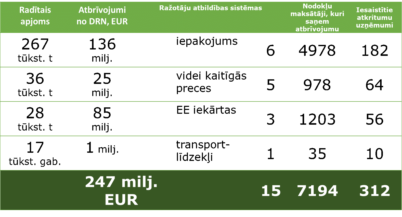 Valsts vides dienests (VVD) šobrīd veic atkritumu apsaimniekošanas sistēmu (turpmāk – ražotāju atbildības sistēmas), kas nodrošina ražotāju uzdevumā realizēto preču atkritumu apsaimniekošanu, auditēto pārskatu izvērtēšanu par darbību 2020. gadā. Ražotāji, kas noslēguši līgumus ar ražotāju atbildības sistēmu, 2020. gadā piemērojuši atbrīvojumu no dabas resursu nodokļa samaksas par videi kaitīgām precēm (t.sk. elektriskām un elektroniskām iekārtām), izlietoto iepakojumu un vienreiz lietojamiem galda traukiem un piederumiem un visu veidu transportlīdzekļiem kopumā 246 809 614 EUR apmērā.